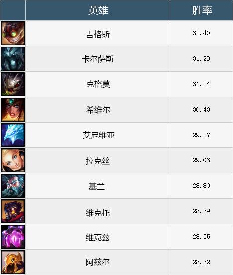 人气英雄到哪里都是人气英雄,但劫在这个模式中的贡献,除了WEQ清兵真的没有别的用了——遗憾的是清兵比他强的一抓一大把,劫的胜率为15.44%。