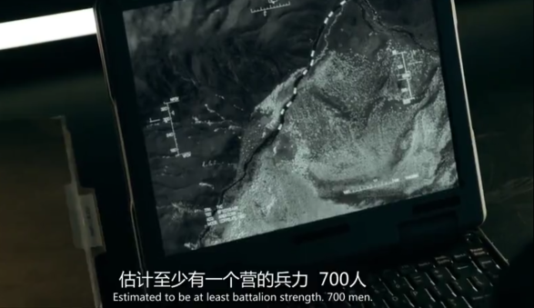 但是,编剧又加了点料。这个间谍趁着海豹们给他妻子治疗伤口的时候溜了,这点我倒是不理解,按说他的这种情况落在美军手里是条活路,落在俄军手里是死路,逃跑了算怎么回事呢?难道打算向我们社会主义投诚?看到后来我才知道,原来因为他的出逃,导致整个行动时间耽搁太久,此刻已经天亮,虽然最终海豹们把他找到了,但白天已经无法偷渡出境,因为就在海豹寻找间谍的时候,中国军队的一个营已经在赶往飞机失事地域了,并且中国军队的直升机也在边境附近盘旋。透过美军指挥部卫星侦查图像,我们可以看到中国军队是乘坐卡车前往的,人数有足足700人,这就和美军与俄军人数形成巨大差异,难道在美国人眼中我们解放军还摆脱不了“人海战术”这个标签吗。