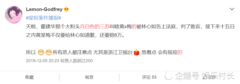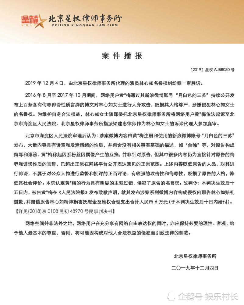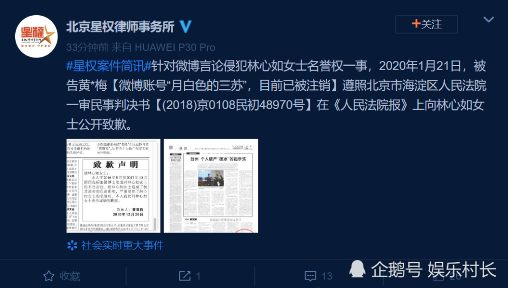 1月21日下午,北京星权律师事务所发布消息通报,写道:“针对微博言论侵犯林心如女士名誉权一事,2020年1月21日,被告黄*梅微博账号“月白色的三苏”,目前已被注销遵照北京市海淀区人民法院一审民事判决书(2018)京0108民初48970号在《人民法院报》上向林心如女士公开致歉。 ”