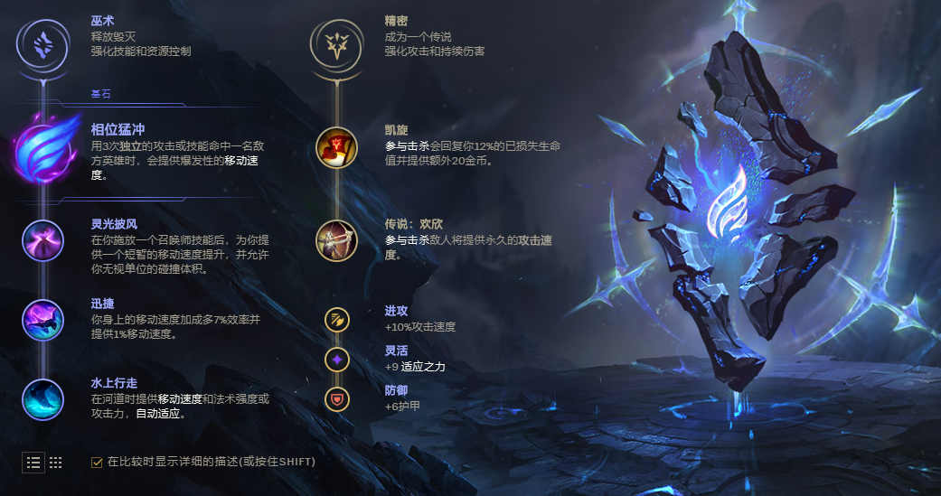 符文选择相位猛冲、灵光披风、迅捷、水上行走。现在雪人是一个非常主动的英雄,放弃了偏肉的余震,之所以不选择掠食者,是因为小符文对雪人帮助不大,而雪人又非常需要披风、迅捷、水上行走这三个小符文,所以才会选择相位。