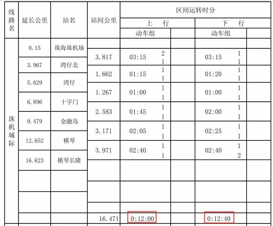 从图中可以看出,珠海站到横琴长隆站仅需12分40秒,横琴长隆站到珠海站仅需12分钟。若算上启动与停车的时间,单程列车行驶约20分钟。