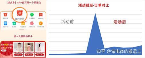 新品秒杀是“橱窗新品”联合“限时秒杀”频道为女装新品专门打造的活动。极大地降低了商家的报名门槛(有新品标商品的商家,0销量要求,免保证金,30件库存即可报名),而且提供的活动曝光位置也是全平台顶级的资源位,在拼多多APP首页第一个频道位。商品参与过活动后,平均自然流量增幅可以达到90%!