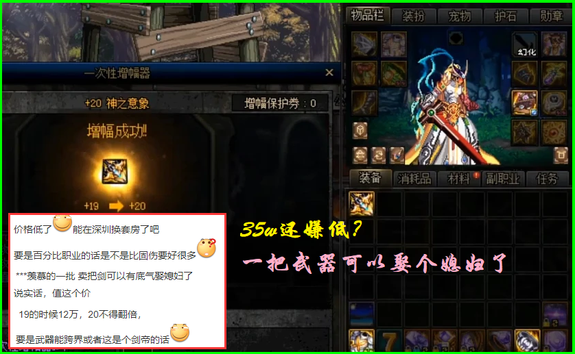 35w到底贵不贵呢?单说价格的话,肯定是不便宜的,但国服唯一把增幅20的巨剑,对于真正想要的玩家来说,如果自己去增幅,别说35w了,就是350w就不一定能成功,所以从这方便来看呢,很多玩家反而觉得35w的价格给低了。