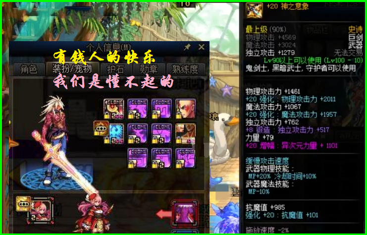 这位玩家的增幅20巨剑是红眼所佩戴的,其实红眼在国服已经算是顶了天的职业,但现在这样看来的话,却有一定的小问题,影响了账号的售价。