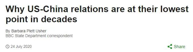 英国广播公司网站7月25日发表题为《中美关系为何跌至几十年来最低点》的文章,内容摘编如下: