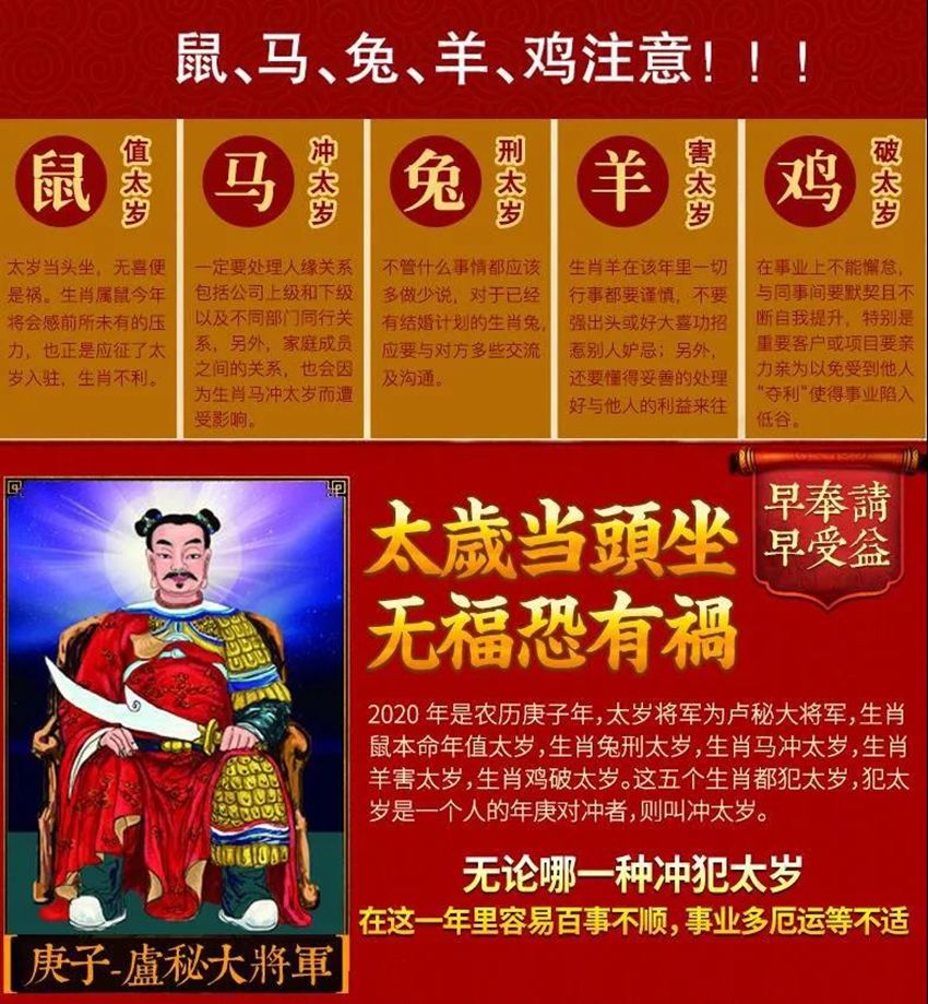 太岁在宇宙运行中,会产生的不一样的磁场,与我们自身的本命八字产生刑冲克害,对我们的命运造成不同的影响,有犯太岁、刑太岁、害太岁、值太岁、流年太岁等。而无论是哪一种,出现犯太岁必定百事不顺,事业多困厄,身体多病变,那么2020年农历庚子年(鼠年)犯太岁的五个生肖鼠、马、羊、兔、鸡,需要注意哪些事情呢?
