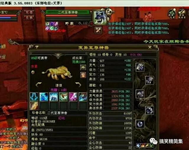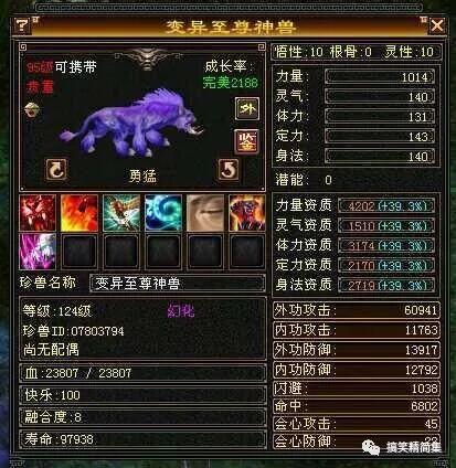 玩家最早见到的变异至尊神兽,来自于东部电信大区天界天龙八部护岛神兽,当时这只珍兽成长率为2388的大完美,但是资质仅仅只有3615,作为一只外功神兽,性格是谨慎的并不显得那么完美。当然技能则非常给力,作为老玩家都应该知道这个老群非常珍贵。