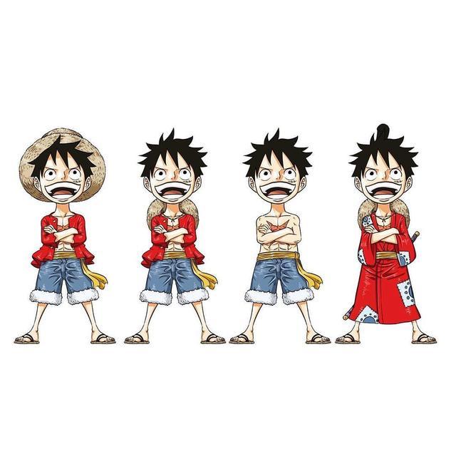 王路飞基本长从头到尾都是这个造型,早期天天穿一件红背心,中期想要有点改变就换了一下背心的颜色,两年后回来也只是把上衣从无袖变成了长袖,到了和之国才总算有了真正意义上的新造型,还是可喜可贺。(八卦时间:其实路飞的衣服是女帝用自己的睡衣改的,磕到了,感谢尾田发糖。)
