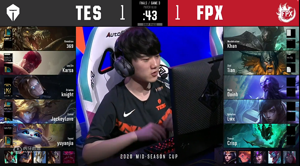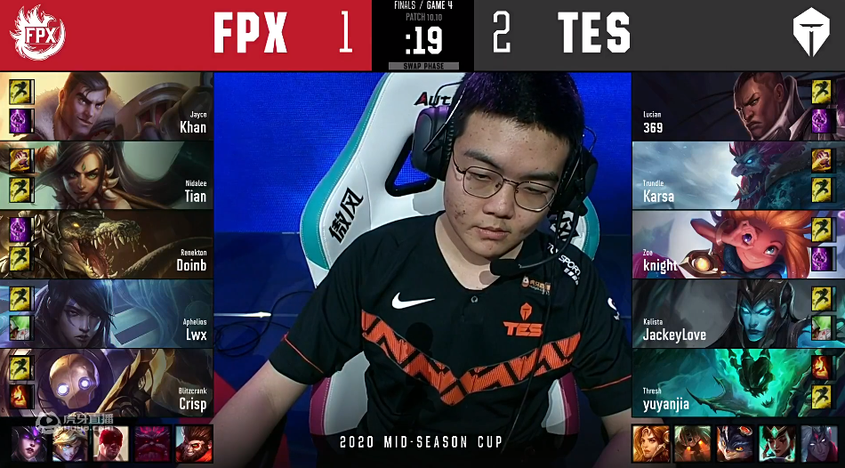 第三局TES着重针对Doinb,光Doinb的英雄TES就Ban掉4个,逼的Doinb祭出绝活瑞兹,可惜FPX的阵容过于手短,被TES抢先拿到赛点。
