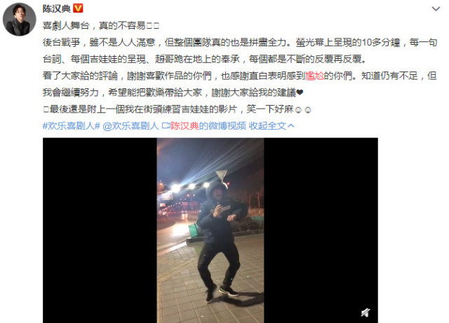 在节目播出后,陈汉典更是被观众吐槽演小品太尴尬,而陈汉典也是发文回应了此事陈汉典回应演小品,表示自己知道仍有不足陈汉典回应演小品,我会继续努力,希望能把欢乐带给大家,谢谢大家给我的建议。也是证明了自己的高情商啊,这个回复非常机智了。