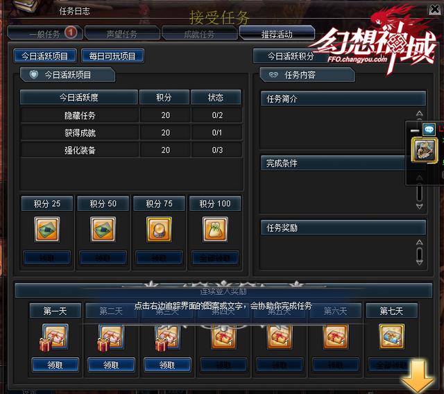 在任务日志-推荐活动中可以清晰的看到幻想神域不删档激活码,只要每天完成指定类型任务,就可获得相应积分,攒到100积分就可以兑换时装。每天一套时装幻想神域不删档激活码,截图达人们千万不要错哦!而除了积分换时装,当角色等级达到15级是也可获得时装。