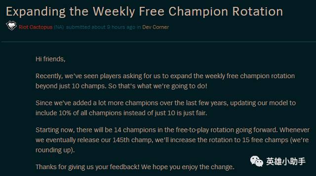 拳头回复的原文也是如此:“从现在起,周免英雄的数量会增加到每周14位。而在我们放出第145位英雄时,我们会将这个数字提升到15(四舍五入)。”,这也就意味着,等未来发布英雄总数量达到145时,周免英雄也将会是15位!