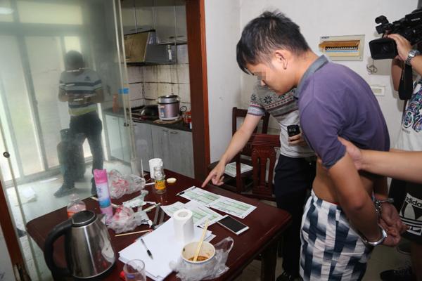 在江夏区藏龙岛一处窝点内,桌上还有许多准备填写的快递单。 王威 摄