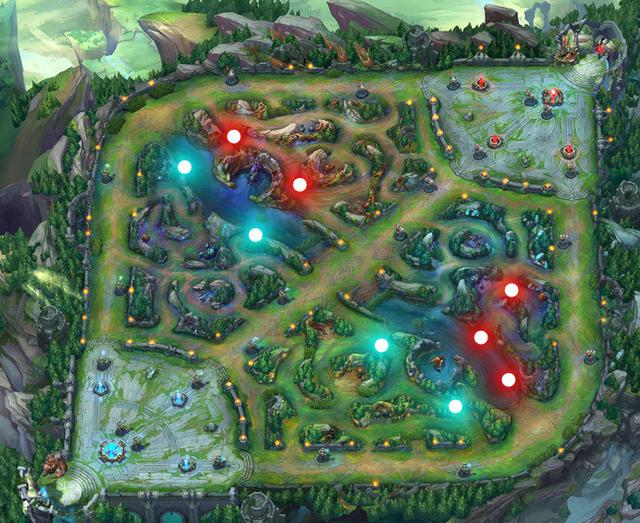 我做了一个图,蓝点是己方英雄站位,红点是可以做视野来帮助打野制定前期作战计划