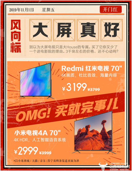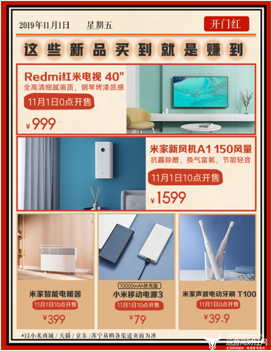 本次小米双11的另一看点,多款新品齐聚首,新意满满。999元Redmi 红米电视 40英寸、39.9元米家声波电动牙刷T100,于11月1日0点开售。此外,1599元米家新风机A1 150风量、399元米家智能电暖器和79元小米移动电源3(10000mAh快充版),将于11月1日早10点开售。