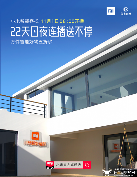一直注重参与感的小米,在这个双11玩出了新花样, 不仅为消费者献上一场促销盛宴, 而且在10月20日到11月11日期间,举办一场连续22天的超长淘宝直播,每天24小时不断电,为消费者提供双11最优惠的产品信息。据悉,从11月1日开始,小米将对此次超长直播进行升级,主题为「小米智能客栈」,旨在给消费者展现智能的未来生活,同时也能让消费者在小米旗舰店畅快地买买买。