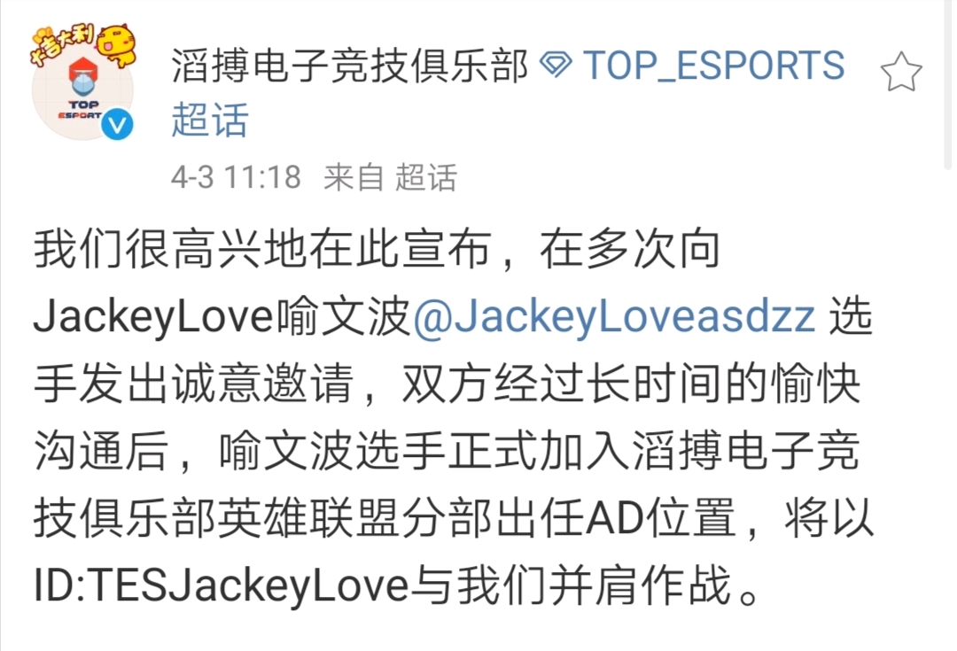 自LPL2019冬季转会期窗口开启,围绕着关于“阿水去哪儿”的话题一直是大家关注的焦点。然而,2020年春季赛打响,Jackeylove去向依然成迷,4月3日,滔博正式宣布阿水加盟,这出转会大戏也由此落下帷幕。虽然滔博在经历年后小颓势之后逐渐找回状态,但新人AD选手Photic一直为大家所诟病,期待Jackeylove的加入能给滔博注入一针强心剂!