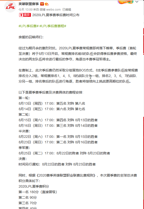 烈日炎炎,太阳如一个斗大的火盆一般炙烤着大地,此刻小编正汗流浃背的给大家编辑这条消息,今天中午英雄联盟赛事官方正式公布了,2020LPL夏季赛季后赛时间及规则。