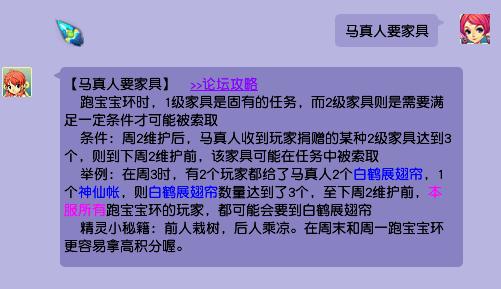 可能有很多小伙伴不太信这个,不过小编觉得既然精灵都有了解释,应该是会有效果的,小编一般扔三个红木八仙桌,小伙伴们也可以跟别的跑环玩家商量一下,各丢三个不重复的二家。如果错过了或者没扔也没关系,那就尽量选择周一或者周末去跑环,小编感觉要家具的可能性大不少!