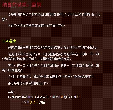 1、TBC时代出现在禁魔监狱。根据下图的任务描述米尔豪斯法力风暴,风暴要塞的禁魔监狱里关押着燃烧军团和古神手下的BOSS,法力风暴只是无辜的偷渡者。