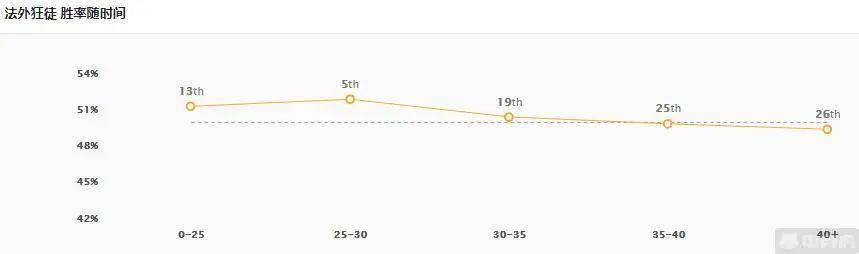 男枪胜率随时间变化:在25-30分钟就已经达到高潮,发育周期远小于千珏,强势期到来更早