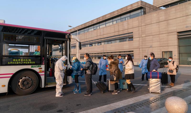 虹桥火车站西广场,一辆辆等待转运重点旅客的商务车、大巴车整齐停放。16时50分许,9名来自重点地区的A类旅客,在闵行公安民警的引导下,登上一辆转运大巴。