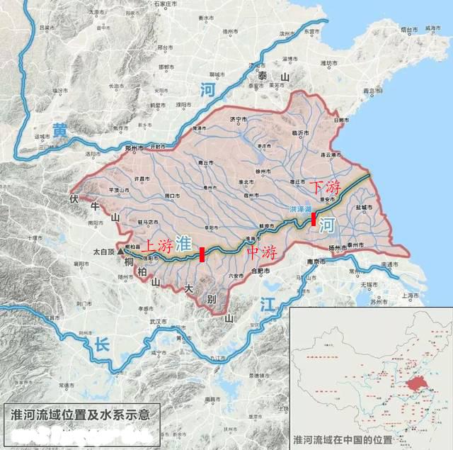 纵观《孟子》中的江、淮、河、汉四大河流,能够发生“洪水横流、水逆行”情况的只有淮河流域。淮河干流分为上游、中游、下游三部分,全长1000公里,总落差200米。洪河口以上为上游,长360公里,地面落差178米,流域面积3.06万平方公里;洪河口以下至洪泽湖出口中渡为中游,长490公里,地面落差16米,中渡以上流域面积15.8万平方公里;中渡以下至三江营为下游入江水道,长150公里,三江营以上流域面积为16.46万平方公里。简单概况,淮河流域中下游640公里长的广大区域,落差只有22米,淮河在进入豫皖交界的洪河口后的中游安徽流域全境,淮河落差只有16米。淮河中游以下广大区域在这种情况下如何流入大海,是一个很大的问题。