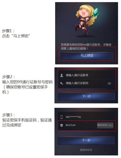 打开掌上魔域,按照提示进行操作,绑定之前,请确保您的通行证已设置密保手机。