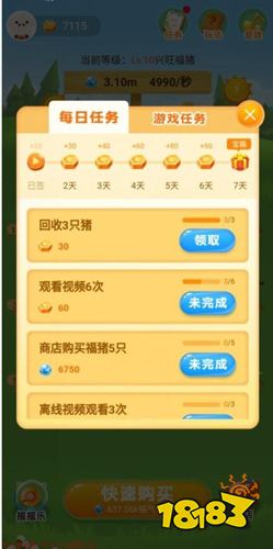 除了养猪赚金币之外,我们还可以做每日任务和游戏任务来获取金币,每日任务是每天刷新的,而游戏任务则是固定的,做完了就没了,但是想要做完还是有一定难度的。