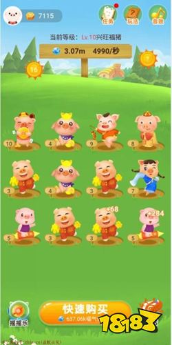 不知道大家参与过淘宝的叠猫猫活动没有,养猪的方式跟叠猫猫活动类似。系统开始会赠送我们一定量的福气值,我们首先用福气值购买两只一级猪,两只一级猪可以合成一只二级猪,而两只二级猪可以获得一只三级猪,以此类推。每升级获得更高等级的猪,我们都会获得一定量的金币,合成等级越高的猪,每次获得的金币就越多。除此之外,我们还可以点击屏幕上方的太阳以获取金币。