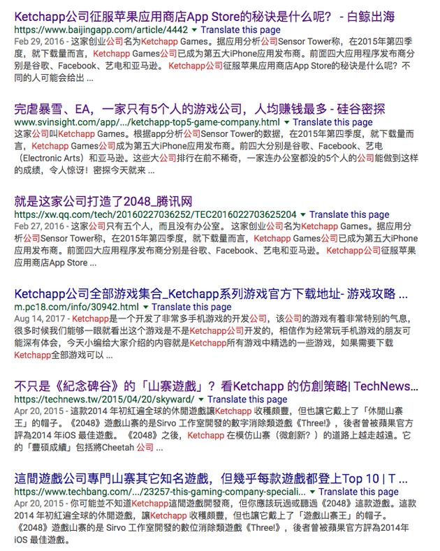 在Google中搜索“Ketchapp公司”,几乎全是这样的新闻标题,大家感受一下: