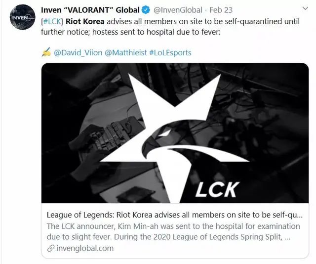 “考虑到疫情影响,为了确保安全防止病毒蔓延,LCK春季赛将在第一轮比赛结束后无限期停赛,次级联赛也一并停止。”