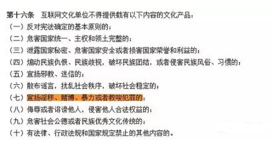 另外,早在2011年3月21日,文化部就曾发布《互联网文化管理暂行规定》,规定已于2011年4月1日正式施行。规定第十六条第七小条表明,互联网文化单位不得提供载有宣扬淫秽、赌博、暴力或者教唆犯罪的文化产品。