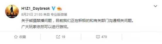 H1Z1中国官方微博@H1Z1_Daybreak则表示,正在就熊猫禁播一事积极与有关部门沟通,从用词来看,“有关部门”并不是“有关公司”,这或许说明禁播并不是简单是熊猫平台的决定。