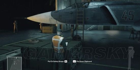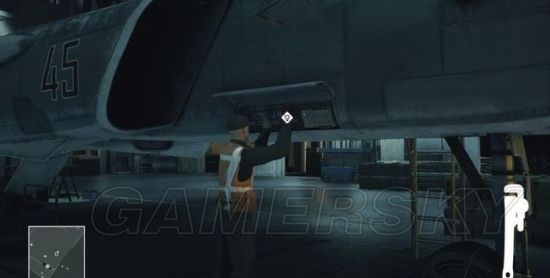 要先到机库旁边的更衣室换维修工服装,然后到仓库拿板手,趁两名维修工不备上前破坏飞机的座椅装置。