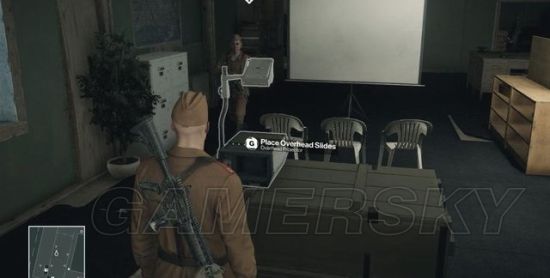 首先伪装成苏联士兵,在1楼的办公区听两名警卫谈话,从桌上拾取红色文件夹(幻灯片)。然后到2楼的大办公室找上校谈话,奉命将幻灯片放到幻灯片播映机里。