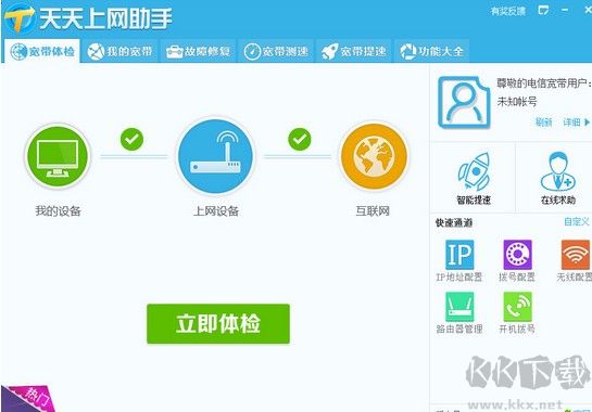 以上便是kk下载给大家介绍的天天上网助手!天天上网助手是一款检测网络故障的软件。如果你的电脑网络出现故障,可以用它来修复!当然,天天上网助手主要是快速测量的软件,是中国电信推出的网络监控工具。如果你家是电信的宽带,可以用于一些辅助操作,为你的网络体检、故障修复、宽带测速、宽带提速提供丰富的功能。有需要的用户快来拿吧!
