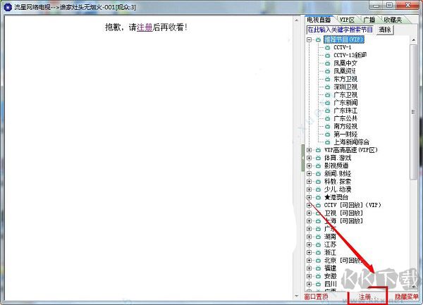 1、打开流星网络电视,点击软件界面右下方的“注册”