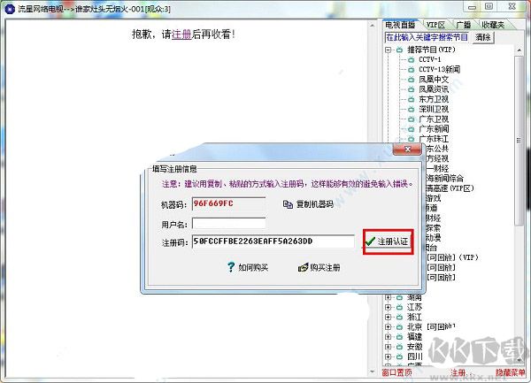4、将得到的流星网络电视注册码复制到软件注册码方框内,输入用户名,点击“注册认证”