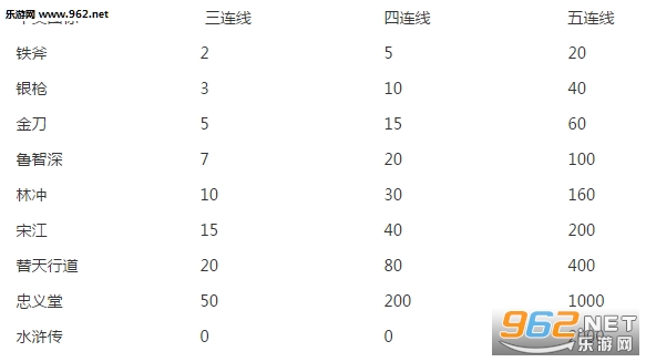 按照指定路线,从左端到右端或从右端到左端连续连接三个相同的图标计算中奖奖金,并按指定倍数分配奖励,其中“水浒传”标志可以代替任何标志。
